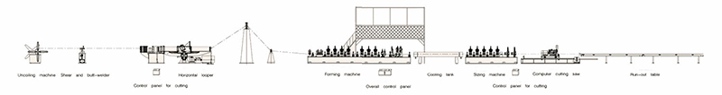 {Steel Tape}→→ Double-head un-coiler →→Strip-head Cutter and welder→→Spiral Accumulator→→Forming section Flattening unit + Main driving unit+Forming unit +Guide unit +High frequency induction welding unit +squeeze Roller)+ De-burr frame →→Cooling unit →→Sizing unit and straightened →→Cutting saw→→ Run-out table